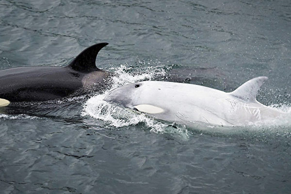 伴随着鳀游克的还有另外两只色素正常的虎鲸:它的母亲和它的祖母。