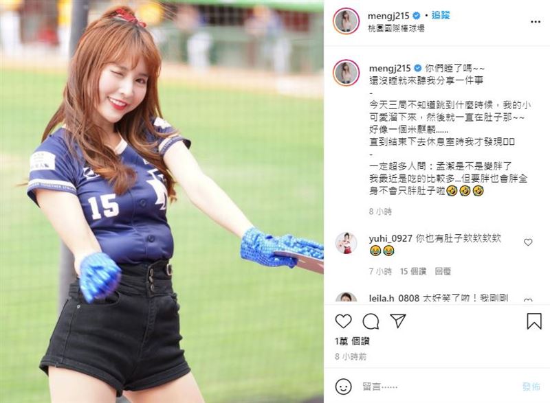 甜美可爱的孟洁,除了在运动实境节目《全明星运动会》担任蓝队女经理,被称为「最正经理」,也是中华职棒乐天桃猿啦啦啦队人气成员,平日会在社群平台和粉丝分享日常,今(19)日凌晨,孟洁在IG分享应援跳到一半时,小可爱整个溜下来到肚子,而自己一直到回休息室才发现,自嘲自己「好像一个米麒麟(米其林)」。
